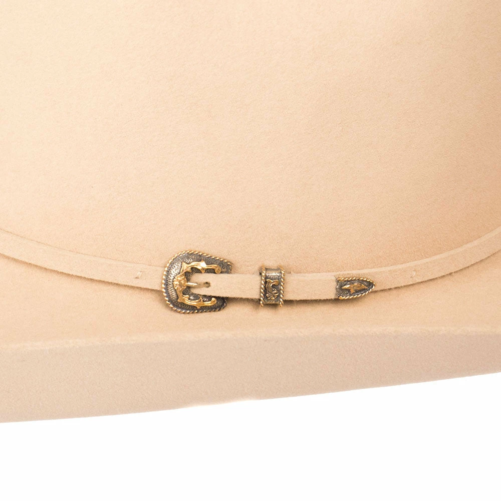 This Rodeo King 30X Buckskin Hat offers a tough, classic look. It features a nice buckskin color, a 4 1/4″ brim, and a matching band with a brass buckle. This hat comes open crown, but feel free to choose a crease and we can crease it for you.
